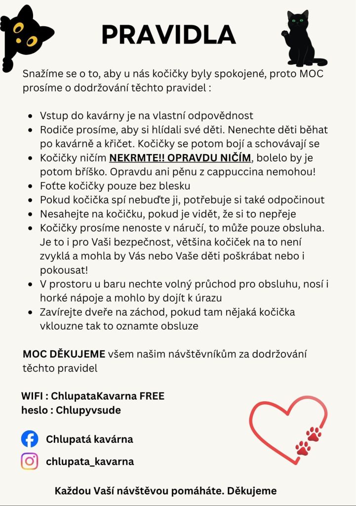 Jelikož se v kavárně nachází kočičky, které byly zachráněné z nevhodných podmínek, zažily bídu a boj o život, mohly být fyzicky či psychicky týrané, důrazně žádáme dodržování následujících pravidel!
